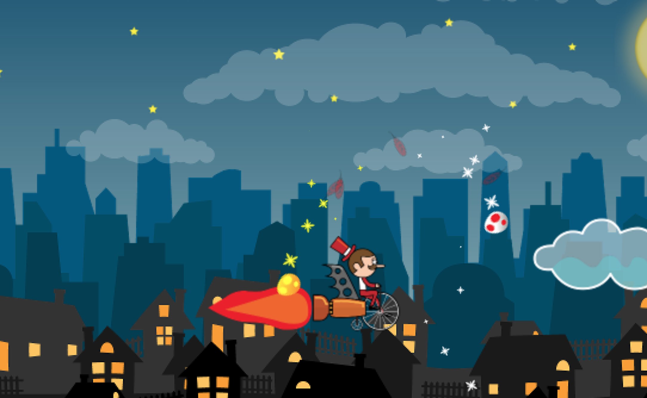 Unfriendly Skies is an arcade game in which you play as a mad scientist flying through the saving the world from an alien invasion. You have invented a flying bicycle powered by rockets to take to the skies, use your advanced weaponry to avoid a host of crazy things trying to take you down.